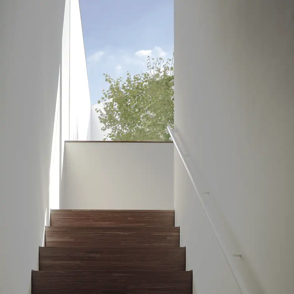 地上3階建ての空間を、木質と石質の重なりで包みます。エントランスに隣接する半屋外空間は、車庫、書斎など、用途に幅を持たせました。内部は、重厚感を持たせながら、光と風が通る空間設計です。土間や縁側などの「間」を現代的な解釈に落とし込み、玄関や寝室の前に、あえて一呼吸を生む導線を設けています。無意識に心身を癒す「間」のエッセンスを採光・通風にも取り入れます。近傍の環境からさりげなく空間を守り、緑陰に入るような心地よさを再現しました。